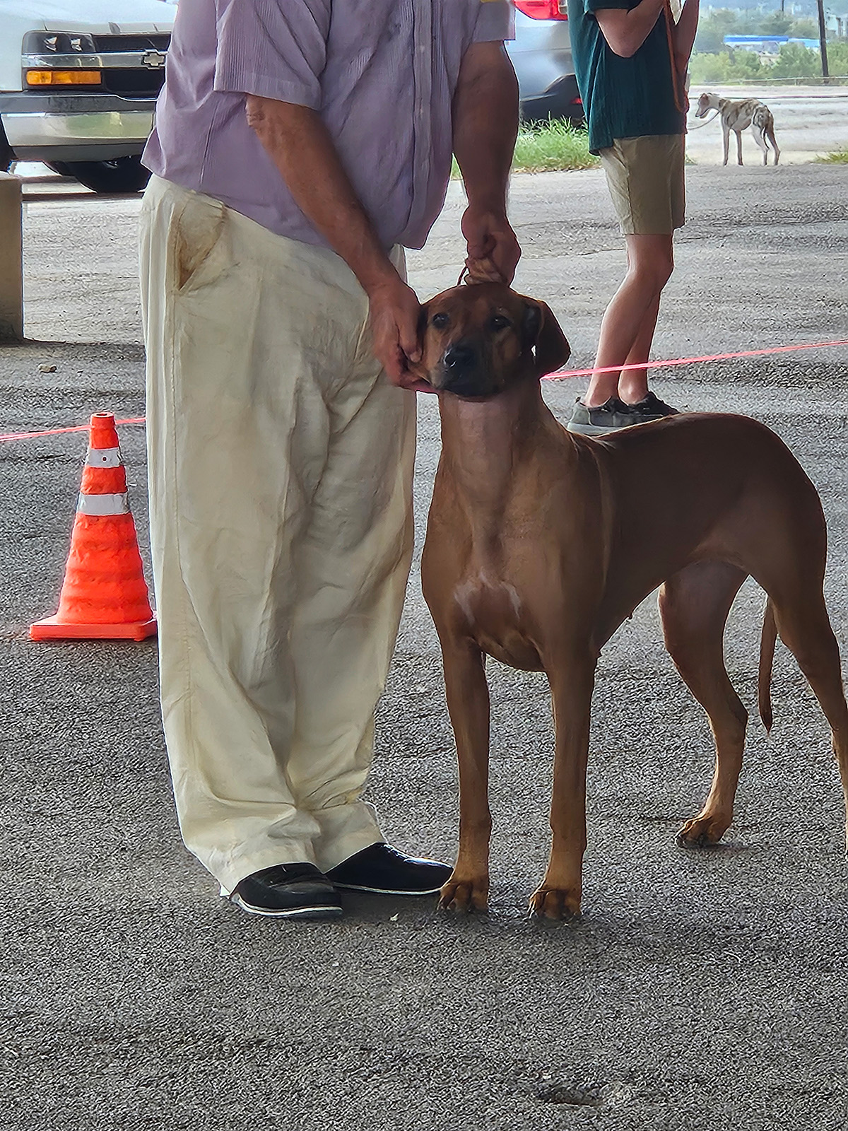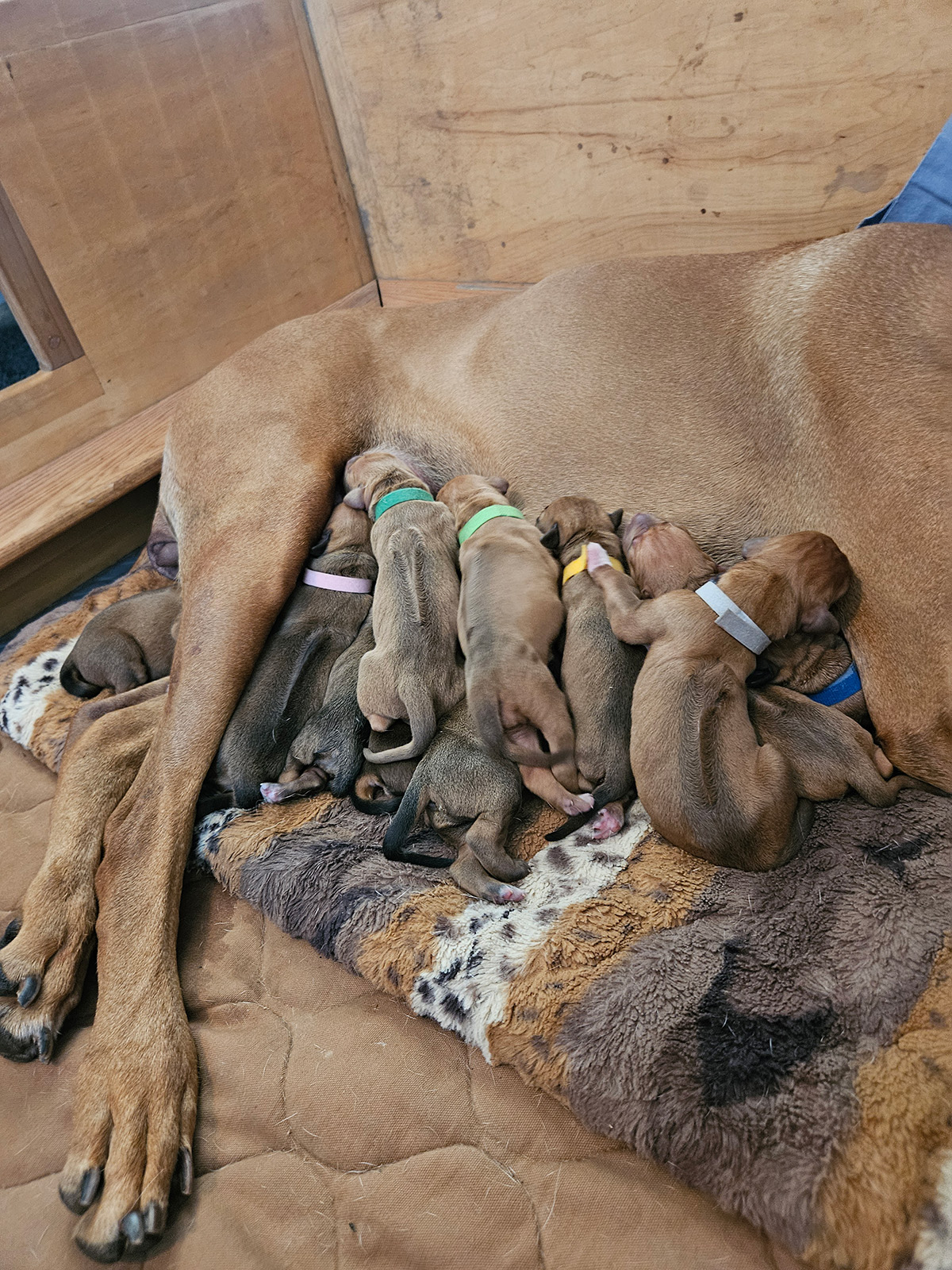 Even more fraught with potential peril is the whelp. Again, when it all goes right, you're barely more than an "assistant" and statistician. When things go "wrong," to any degree, that's where experience is key. We firmly recommend that anyone whelping a litter for the first time have a very experienced Ridgeback breeder assist them, as well as having a veterinarian who is "on call" in case an emergency trip is necessary.